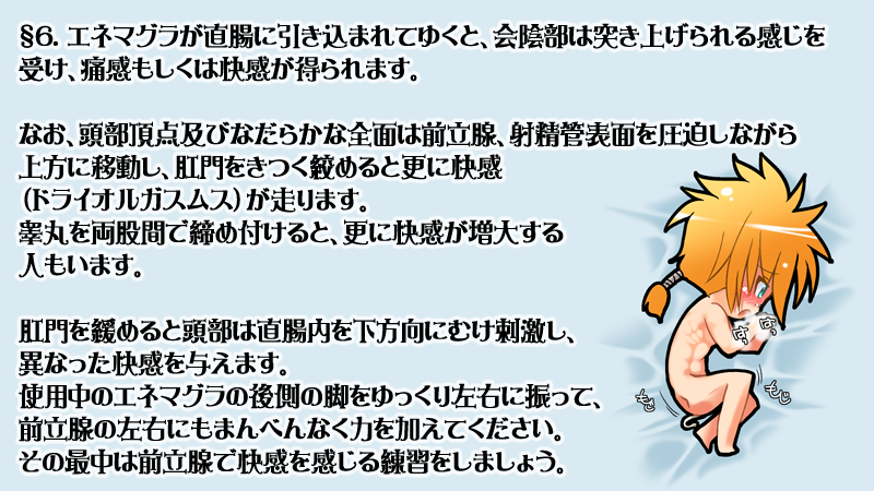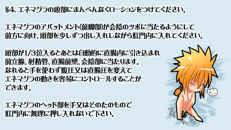 みんな、エネマグラって知ってっか? アメリカの泌尿器科医が元々、前立腺炎の治療のための前立腺マッサージ用に開発した器具ですが、 「くひぃっ!きもちよすぎてちりょうどころじゃないのぉぉぉっ!!らめぇぇぇぇっ!!ばかになりゅのぉ、ばかになったうのぉぉぉぉっ!!」 っていい年したオッサンが前立腺液をピシュピシュ放ちながらよがり狂うほど気持ちよくなるらしいため、性具としても販売されております。 しかしながら「あぎぃぃぃっ!!ぎぼぢい゛い゛い゛っ!!ちんぽじるでちゃぅぅぅぅっ!!びゅくびゅくでちゃうのぉぉぉっ!!あしょこがばくはつしちゃうのぉぉぉっ!!」 と、すだれハゲを振り乱しながらドライオルガスムスを迎える為にはいくつかの正しいステップを踏む必要があります。 ここでは、QMA男子陣の隠れドMとして(俺の中で)名高いリック君と共に、正しいエネマグラの使用法について勉強してゆきましょう。 2011年12月24日